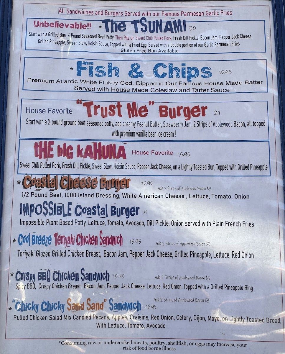 The food items are organized into groups such as boards, burgers, tacos, and shareable plates. Boards feature combinations like the Hang Ten Bacon Board with candied bacon, the Big Wave Brie Board with brie and mango salsa, and the Triple Fin Hummus Board with traditional and flavored hummus served with vegetables. Burgers range from classic options to specialty creations like the Trust Me Burger and the Tsunami Burger. Tacos on the menu include shredded beef, pork with mango salsa, and fish varieties such as Blue Chair Bay Fish Tacos. Other main dishes include Chicken Wings, Chicken Rice, and various sandwiches like the Tsunami Beef Sandwich.