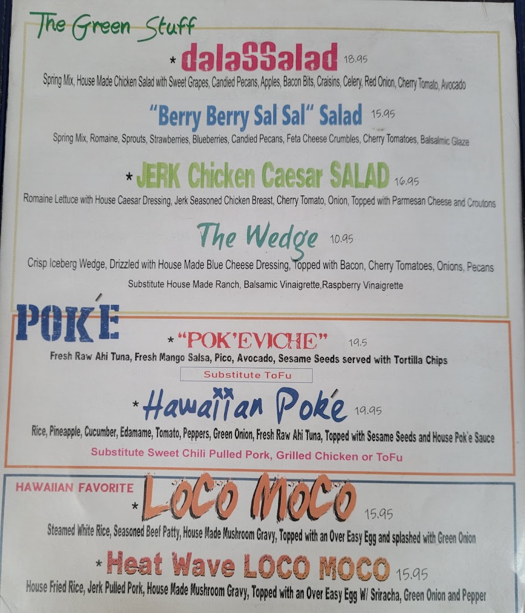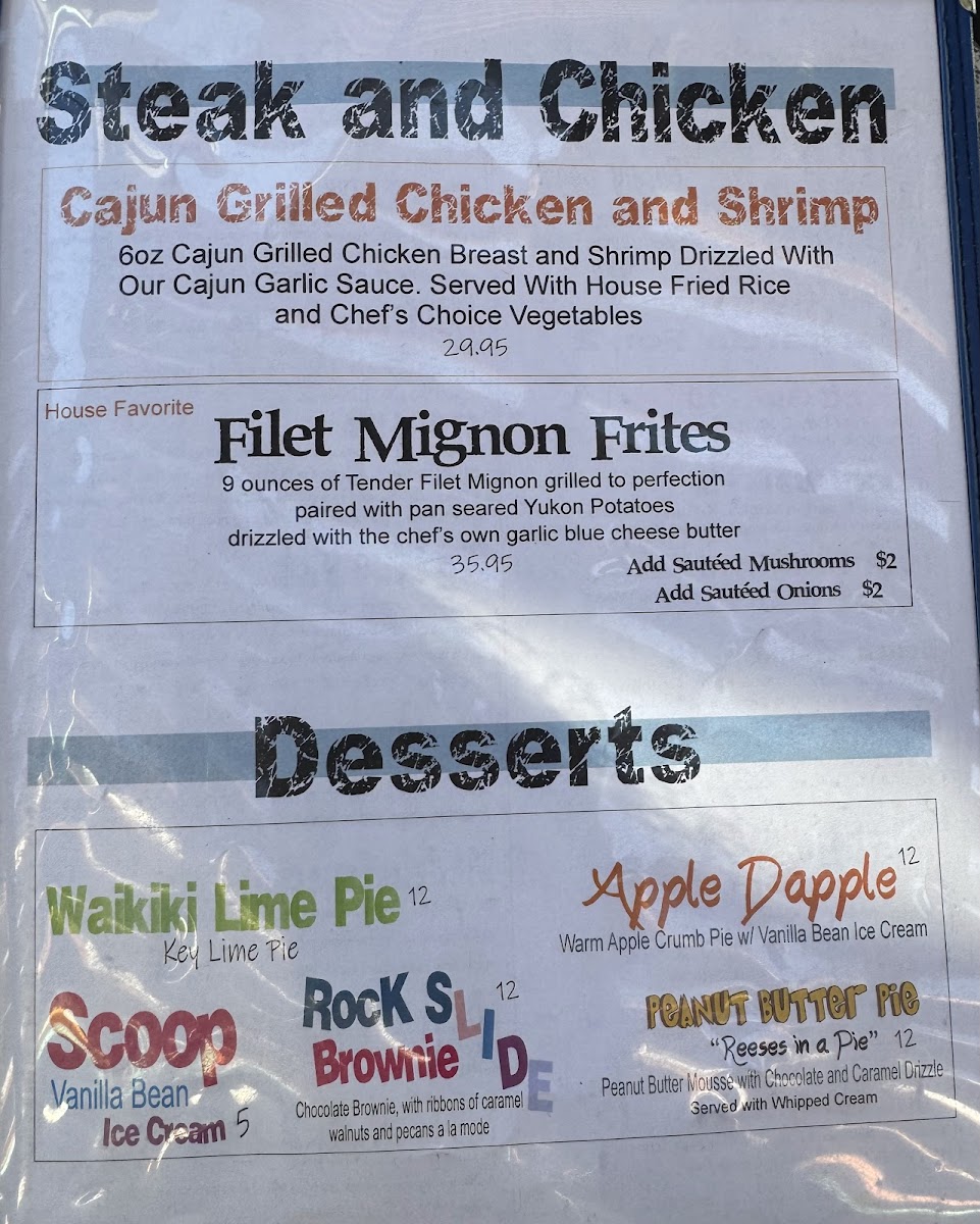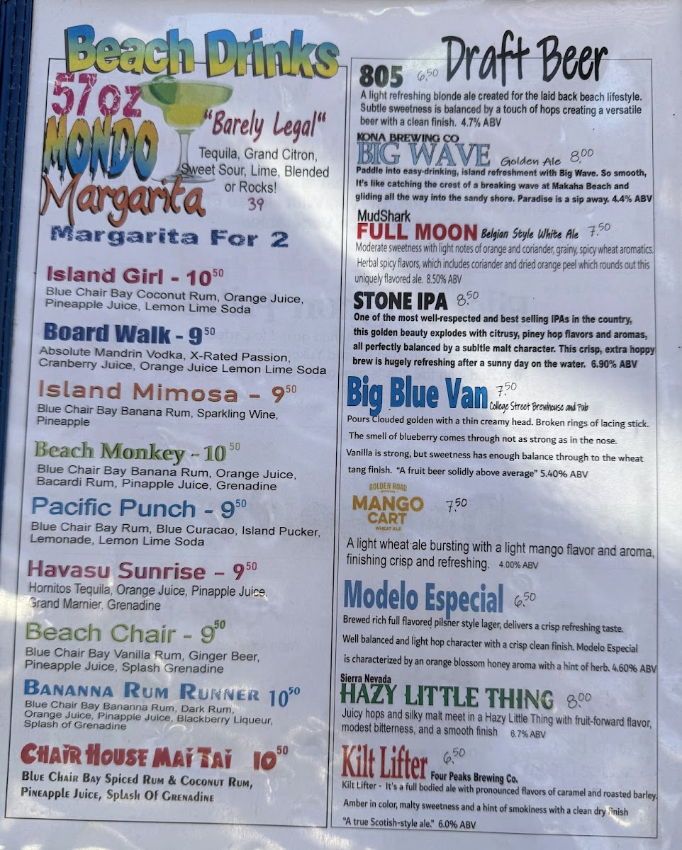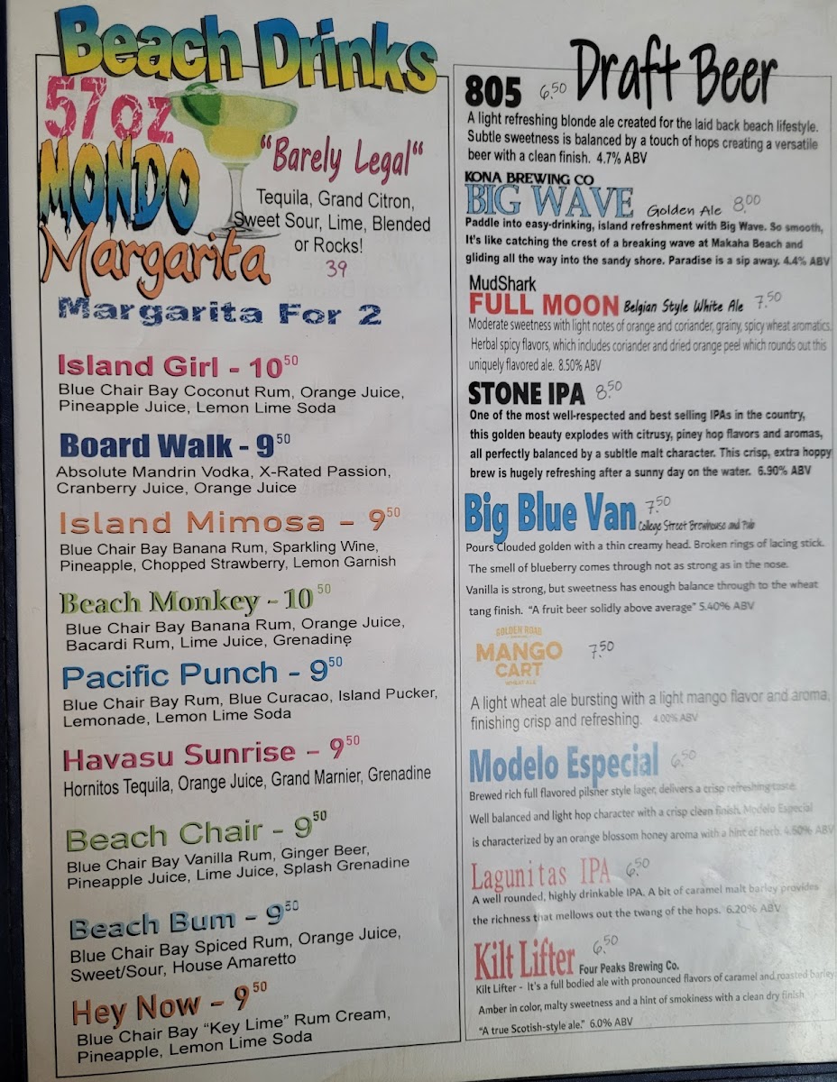 The menu offers a diverse selection of food and beverages suitable for casual dining in Lake Havasu City, AZ. It includes a variety of appetizers, main courses, and drinks that cater to different tastes and preferences.